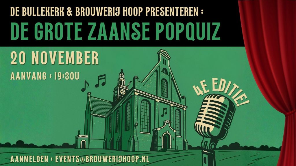 Ben jij klaar om je muziekkennis te testen? Brouwerij Hoop en de Bullekerk verzorgen de vierde editie van de Grote Zaanse Popquiz. Herkenbare popklassiekers, verrassende muziekvragen, leuke prijzen, een felbegeerde wisseltrofee en meer. Teams van maximaal 5 personen kunnen zich aanmelden door een mail te sturen naar events@brouwerijhoop.nl met jullie teamnaam en aantal personen.