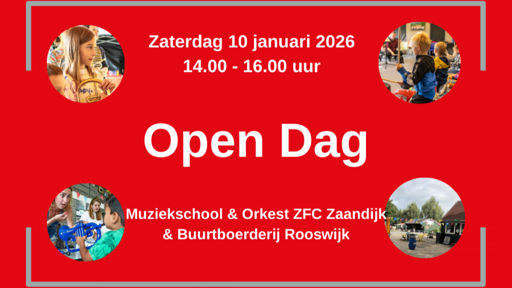 Bij Muziekschool Zaandijk en Buurtboerderij Rooswijk is er vanmiddag een evenement voor alle leeftijden. Je kunt meedoen met spelletjes, rondkijken, naar een optreden luisteren (ca 14.30 uur, Starters- en Talentorkest van de Muziekschool) en zelf instrumenten uitproberen. Wil je vrijwilliger worden bij de Buurtboerderij of gaan meespelen bij één van de orkesten van ZFCZaandijk? Muziekles of een muziekcursus gaan volgen? Je kunt er hier alles over te weten komen.