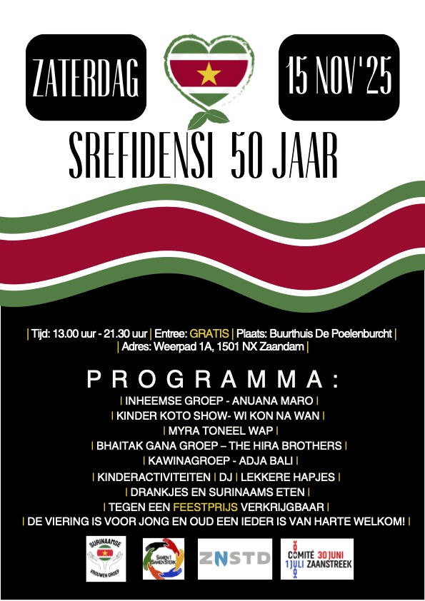 In Buurthuis De Poelenburcht wordt Srefidensi gevierd met een feest vol muziek, dans, zang en lekker eten. De dag laat de rijkdom van de Surinaamse cultuur zien en nodigt iedereen uit om samen te genieten. Een vrolijk en verbindend feest voor jong en oud.