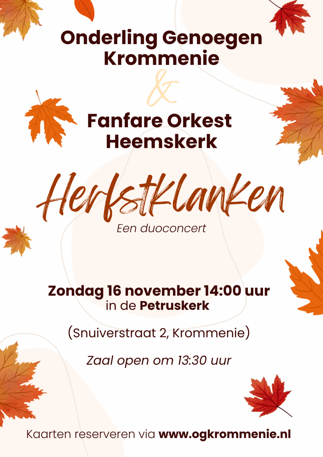 In de Petruskerk klinkt het concert Herfstklanken, waarin muziekverenigingen Onderling Genoegen Krommenie en Fanfare Orkest Heemskerk samen optreden. Bezoekers kunnen genieten van een warm en afwisselend programma vol kleurrijke muziek die perfect past bij het seizoen. Een sfeervolle middag vol harmonie en samenspel.