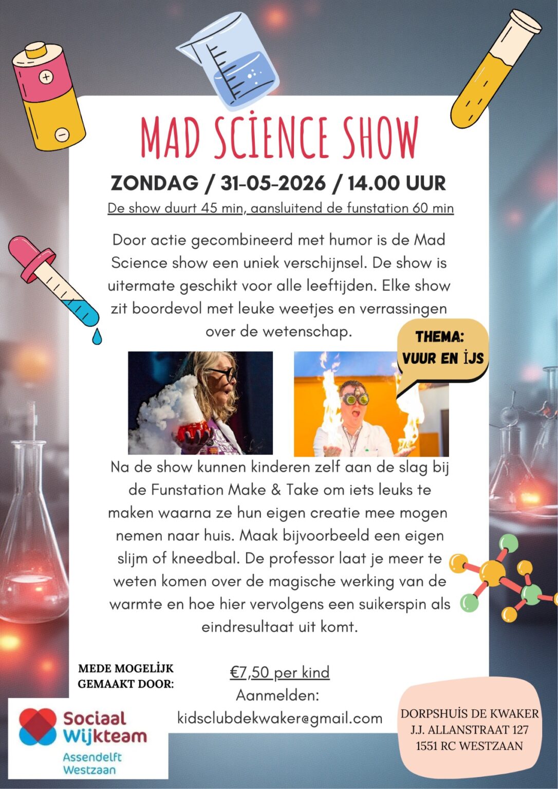 In Dorpshuis De Kwaker wordt een Mad Science Show georganiseerd vol actie, humor en proefjes. De voorstelling zit vol verrassingen en leuke weetjes over wetenschap. Na afloop kunnen kinderen zelf aan de slag met experimenten en iets maken om mee naar huis te nemen. De show is geschikt voor alle leeftijden en combineert leren met plezier. Zie hier de -> flyer.