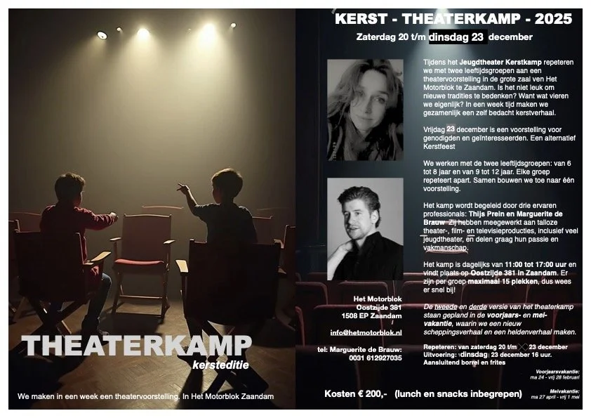 Een theatertalentweek waarin kinderen in twee leeftijdsgroepen werken aan een eigen voorstelling, onder begeleiding van ervaren theatermakers. Er wordt gerepeteerd, bedacht, gespeeld en toegewerkt naar een echte presentatie in Het Motorblok. Het kamp biedt een creatieve en gezellige theaterervaring met veel aandacht voor spelplezier en ontwikkeling.