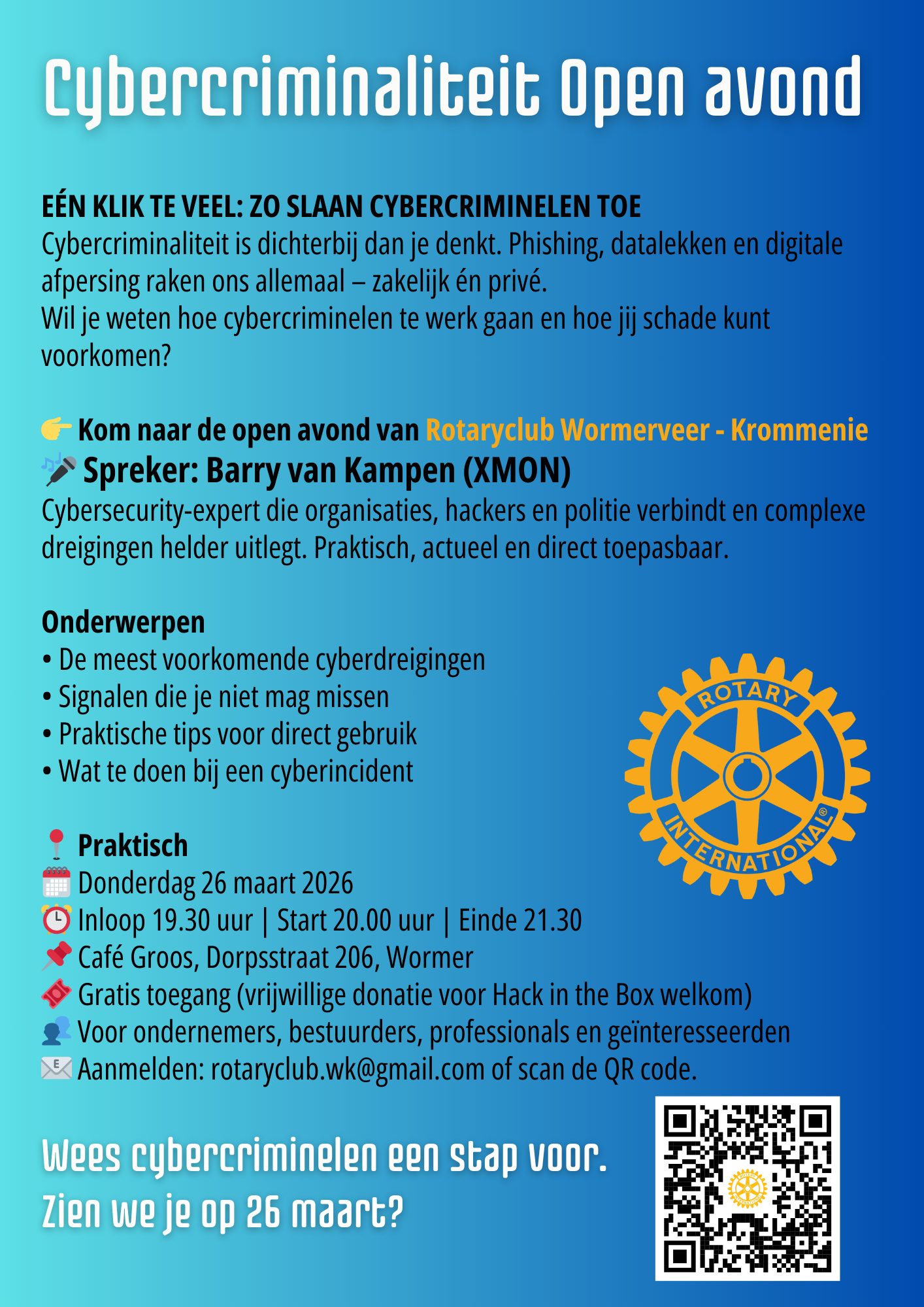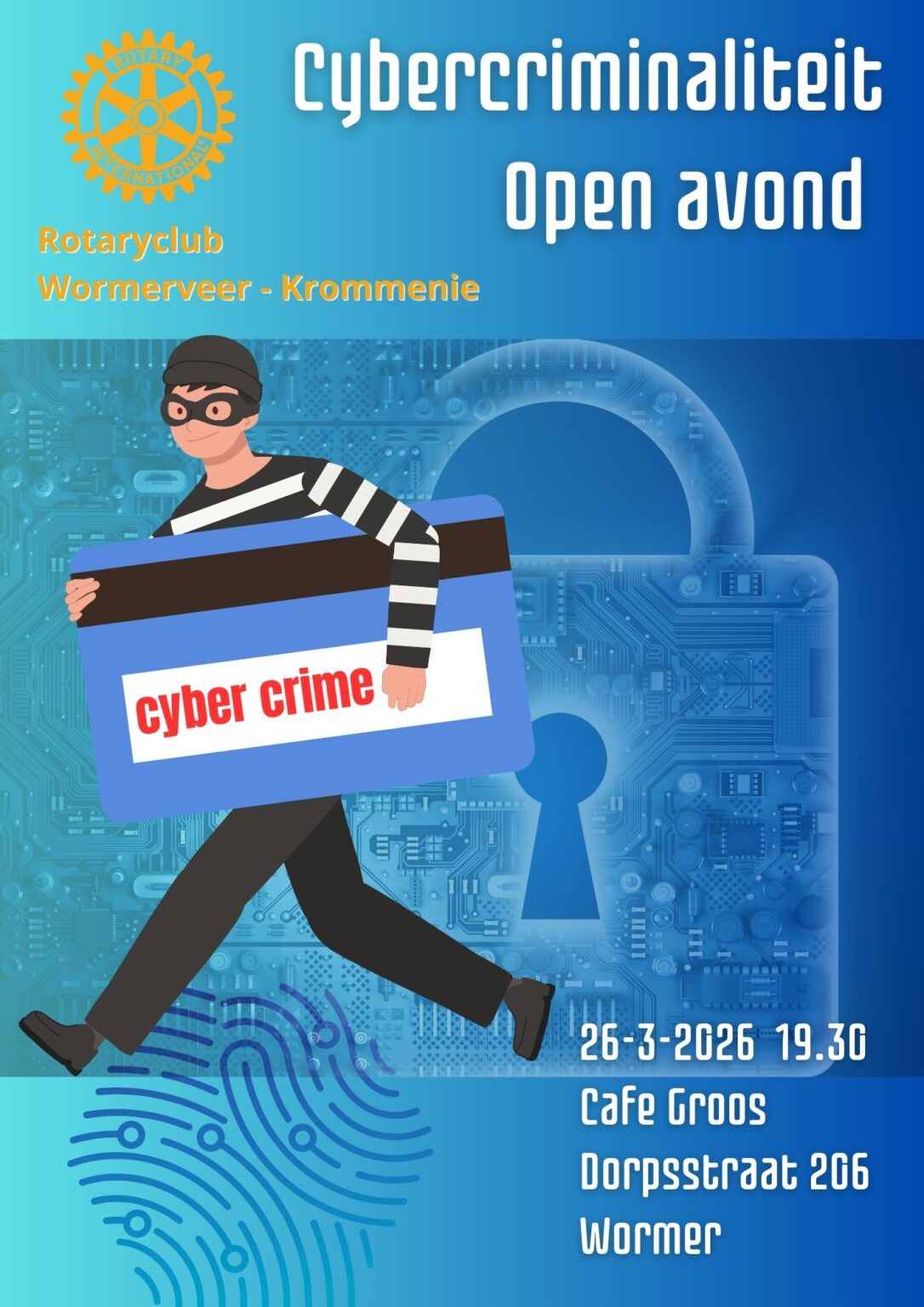 Rotaryclub Wormerveer-Krommenie organiseert een open avond over cybercriminaliteit met spreker Barry van Kampen van XMON. Hij laat zien hoe cybercriminelen te werk gaan en geeft praktische tips om jezelf beter te beschermen. De avond biedt ook een kennismaking met de Rotary en ruimte om in gesprek te gaan. Bekijk hier de -> flyer.