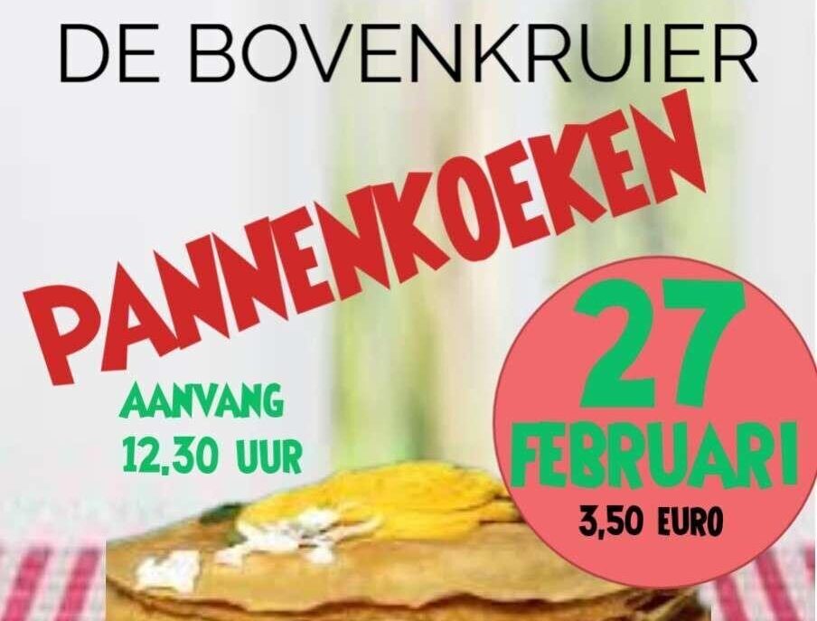 De Bovenkruier organiseert een lekkere en gezellige pannenkoeken middag en je bent van harte uitgenodigd! Schuif gezellig aan en geniet van een heerlijke stapel pannenkoeken in goed gezelschap.