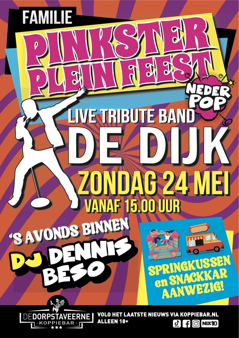 Het Pinksterpleinfeest is een gezellig evenement voor jong en oud met muziek en entertainment. Live tribute band De Dijk zorgt voor een feestelijke sfeer. Later op de avond neemt DJ Dennis Beso het over. Voor kinderen en bezoekers zijn er ook extra’s zoals een springkussen en een snackkar. Zie hier de -> flyer.