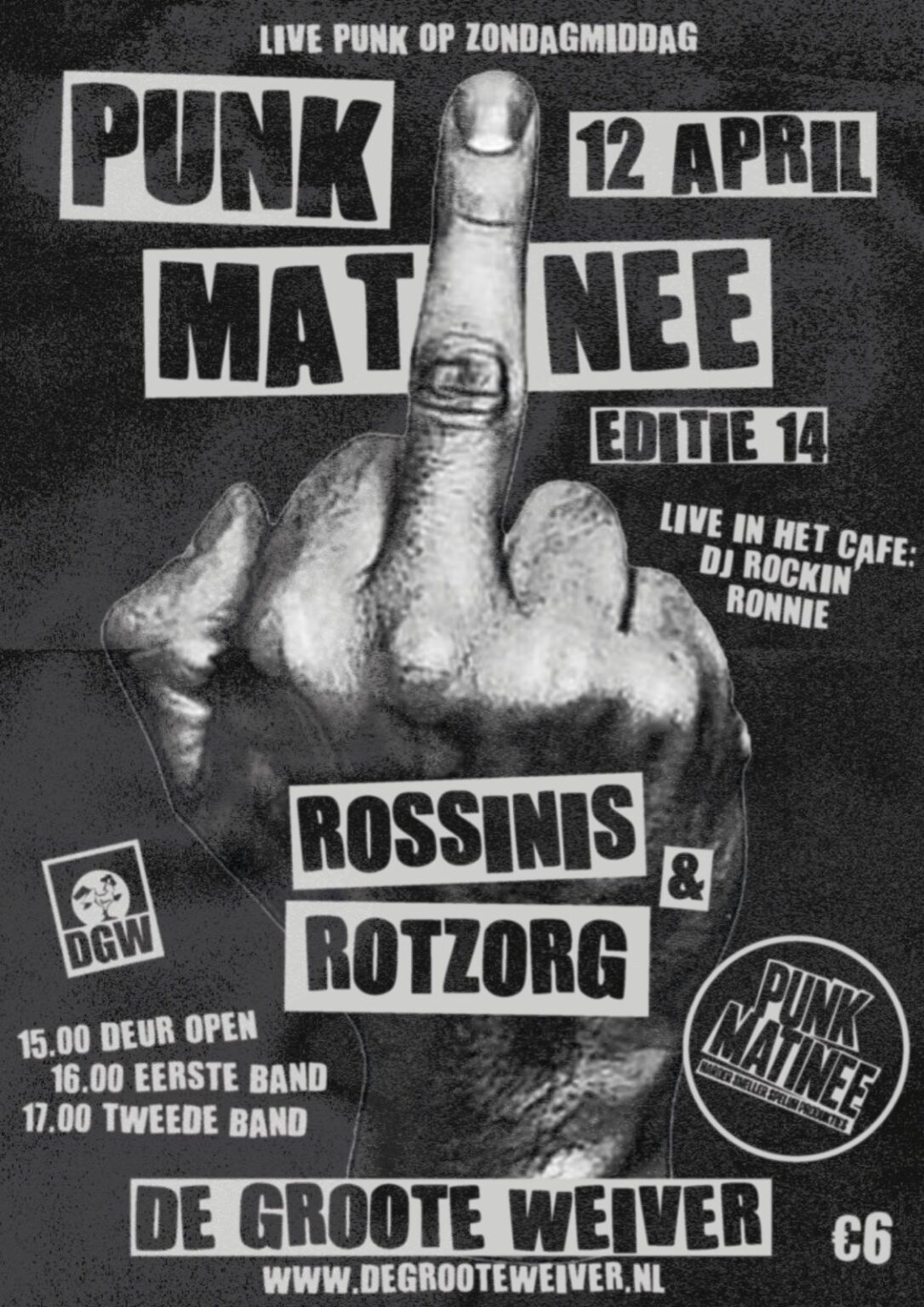 Tijdens Punk Matinee spelen twee punkbands en draait een dj muziek in De Groote Weiver. Bezoekers kunnen genieten van energieke live optredens en een ontspannen sfeer in het café. Het belooft een stevige en gezellige middag te worden voor liefhebbers van punk. Bekijk hier de -> flyer.