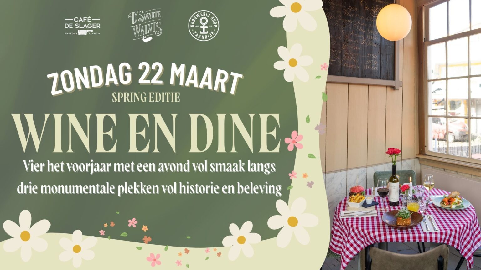 Tijdens deze culinaire wandeling langs de Zaan genieten deelnemers van een driegangendiner met bijpassende wijnen op drie bijzondere locaties: Café De Slager, D’Swarte Walvis en Brouwerij HOOP. De route verbindt monumentale plekken met seizoensgerechten en een gezellige sfeer. Het resultaat is een smakelijke voorjaarsavond met eten, wijn en een wandeling langs de Zaan.